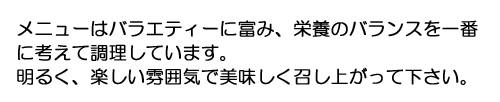 ご飯とお味噌汁は食べ放題です。夜間の学生さんや部活やゼミなどで食事が遅くなる人にも対応できます。毎日の食事は健康の基礎で、生活の楽しみでもあります。豊富なメニュー、栄養のバランス、学生さんの好みを考え、手作りで調理しています。ボリュームも有ります。おいしく召し上がって下さい。